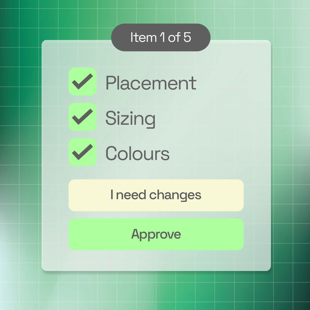 Build a checklist to guide clients through each item — spelling, colours, placement, sizing — and clients have to tick every box before they can approve. No more "I didn't notice the logo was wrong."